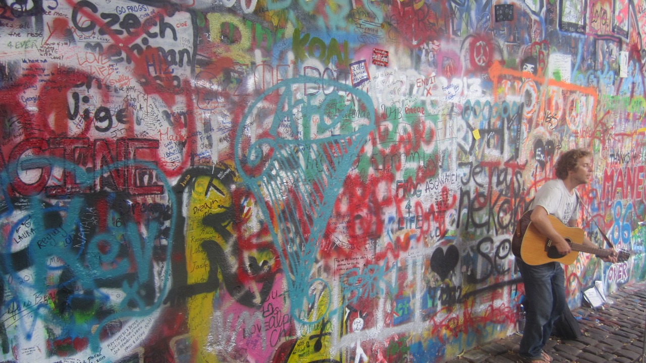 "The Lennon Wall or John Lennon Wall. Once a normal wall, since the 1980s it has been filled with John Lennon-inspired graffiti and pieces of lyrics from Beatles songs.